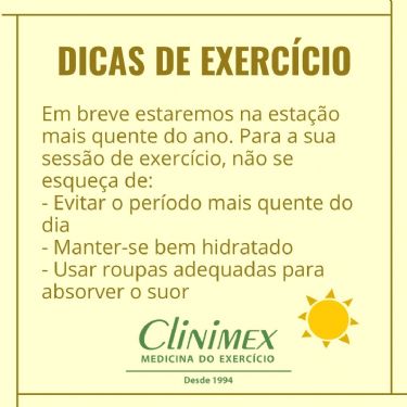Estamos no mês de dezembro e, em breve, entraremos na estação mais quente do ano: o verão. Temperatura ambiente elevada, principalmente quando associada a alta umidade relativa do ar, dificulta a manutenção da temperatura corporal adequada e aumenta a taxa de suor produzido durante a prática de exercício físico, podendo levar a redução do desempenho físico, desidratação e hipertermia.Para praticar exercício físico com segurança, aí vão algumas dicas: - Procure se exercitar em períodos do dia em que a temperatura está mais baixa, como início da manhã; - Mantenha-se bem hidratado antes, durante e após a prática do exercício físico; - Use roupas leves e adequadas para a absorção do suor produzido durante o exercício; - Ao se exercitar ao ar livre em dias ensolarados, vista roupas claras; - E se sua vestimenta ficar encharcada, lembre-se de que o estresse térmico está muito alto.#clinimex #exercicio #exerciciofisico #reabilitacao #verao #temperaturacorporal #atividadefisica
