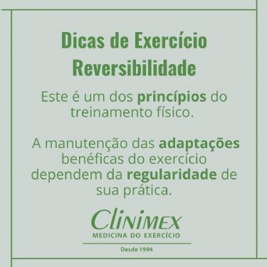 Um dos princípios do treinamento físico, a reversibilidade diz respeito ao fato de que as adaptações benéficas oriundas do exercício físico são perdidas quando há interrupção na regularidade de sua prática.Desta forma, ter sido ativo na infância e adolescência não é suficiente para manter uma boa saúde se forem mantidos hábitos sedentários na vida adulta. A regularidade na prática de exercício físico é importante em todas as idades. E, lembre-se, nunca é tarde para (re)começar!Quer retornar à prática de exercício físico e não sabe como? Nós podemos lhe ajudar.Entre em contato conosco!#exercicio #exerciciofisico #atividadefisica #saude #mev #clinimex #reabilitacao #reabilitacaocardiaca